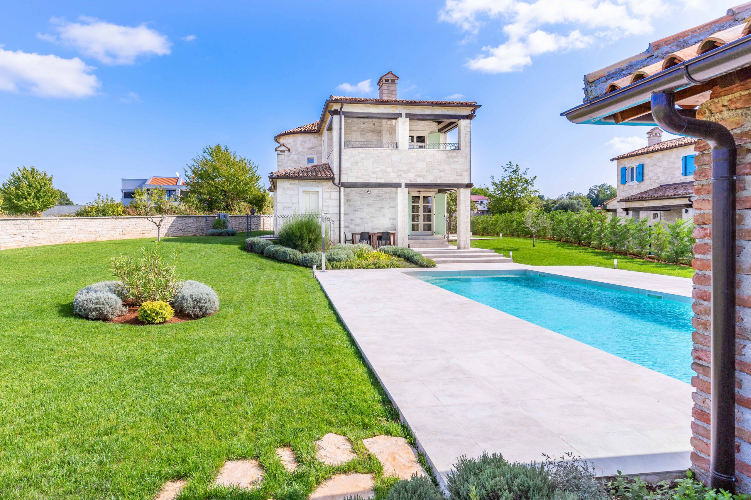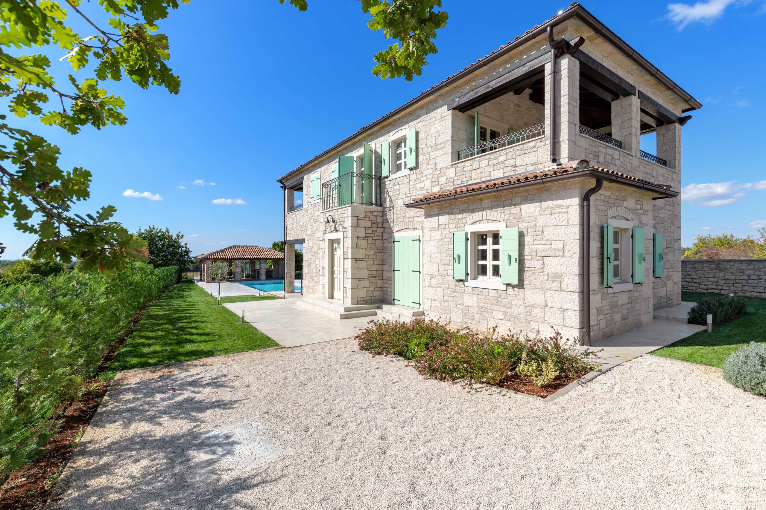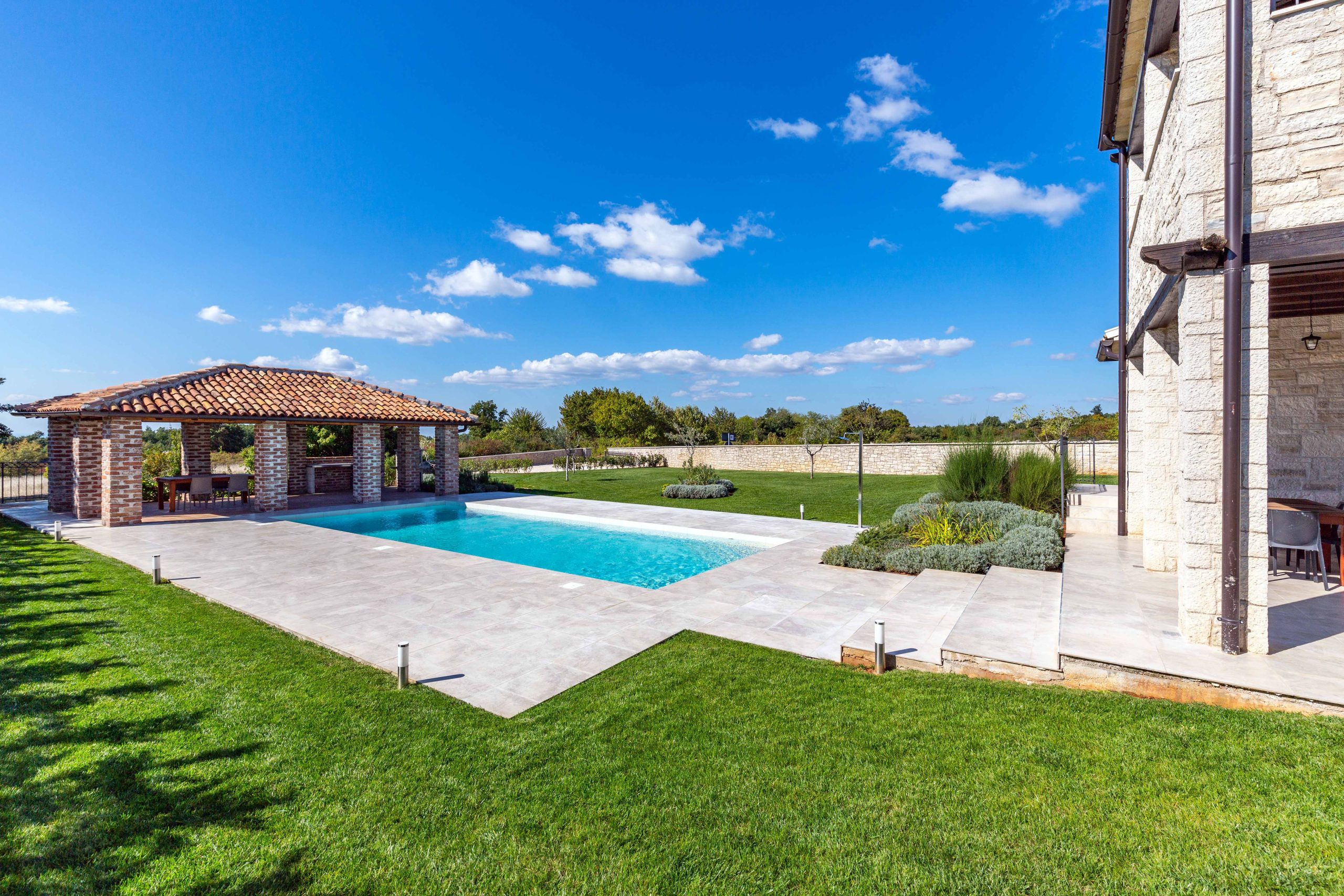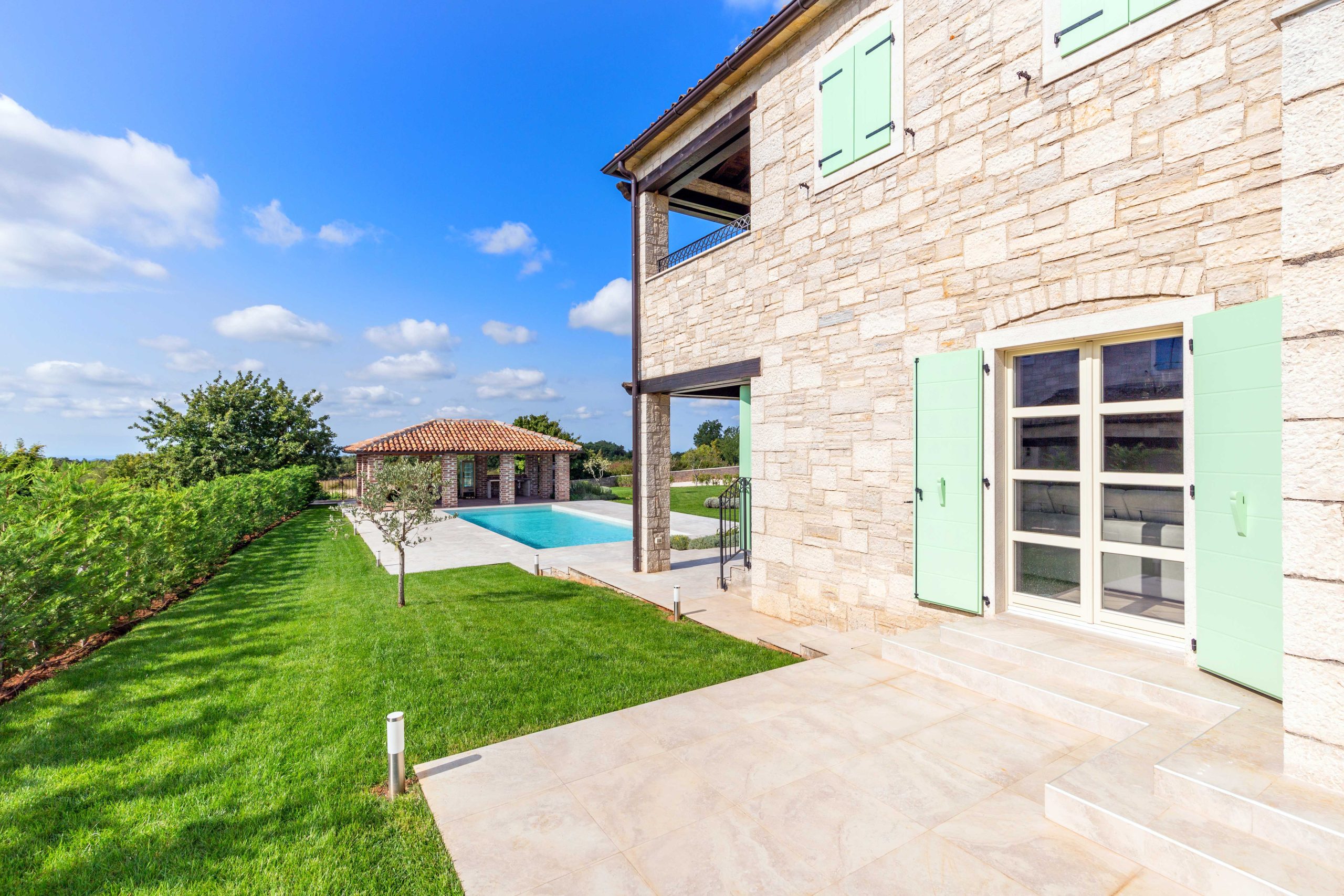 Vanjski prostor vile koncipiran je za ugodan boravak na otvorenom, s terasama i otvorenim pogledom na mirno istarsko okruženje.